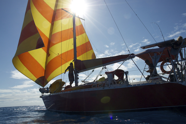Catherine et Nicolas, le 30 août 2014. « Un léviathan farceur apparaît alors soudain sur notre arrière, pour se mettre à examiner tranquillement le bateau. C’est surréaliste... Incroyable de pouvoir l’admirer d’aussi près. Il nous accepte calmement dans son monde et nous nous observons mutuellement dans l’eau pendant 3⁄4 d’heure. Au total, nous avons croisé ce jour-là sur notre route pas moins de quatre espèces de cétacés et ramenons plus de 1000 photos et vidéos à traiter avant notre départ après-demain. Gasp ! »